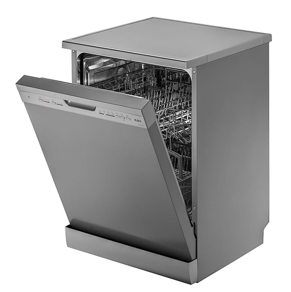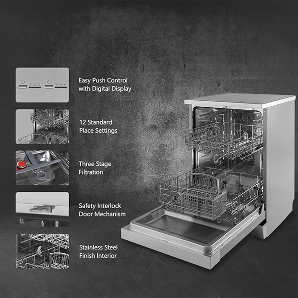 12 standard place settings Free Standing Dishwasher with three stage filteration system ideal for mid-sized family Adjustable automatic rinse agent detergent, Automatic detergent dispencer, Salt container with water softener, Three stage filteration system, Delay function, memory function 4 Wash Programme: Intensive Wash, Eco Wash, 90 Min Wash and Rapid Wash Stainless Steel interior and easy push control with digital display