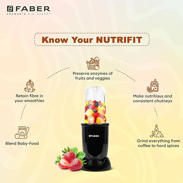 Faber Sportz Blender FSB 2 in 1 Nutrifit Nero can be used for liquidising fruits, milkshakes, soups, dry grinding spices, rice and grains and wet grinding of chutneys, sauces and puree.