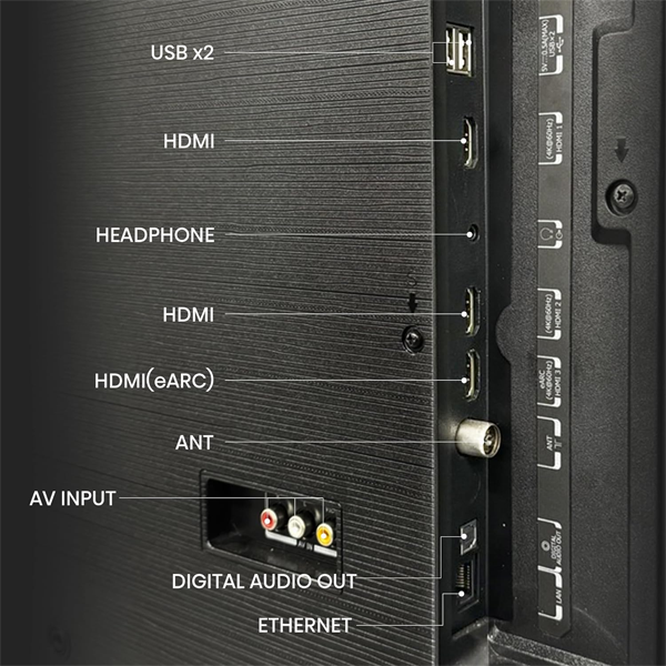 Connectivity: 3 HDMI ports to connect set top box (1HDMI port eARC supported) | 2 USB ports to connect hard drives and other USB devices | Built- in WiFi | Bluetooth | Ethernet RJ45 | 1 earphone Jack | 1 Optical digital audio output (SPDIF) | 1 RF- Radio frequency input | 1 AV input